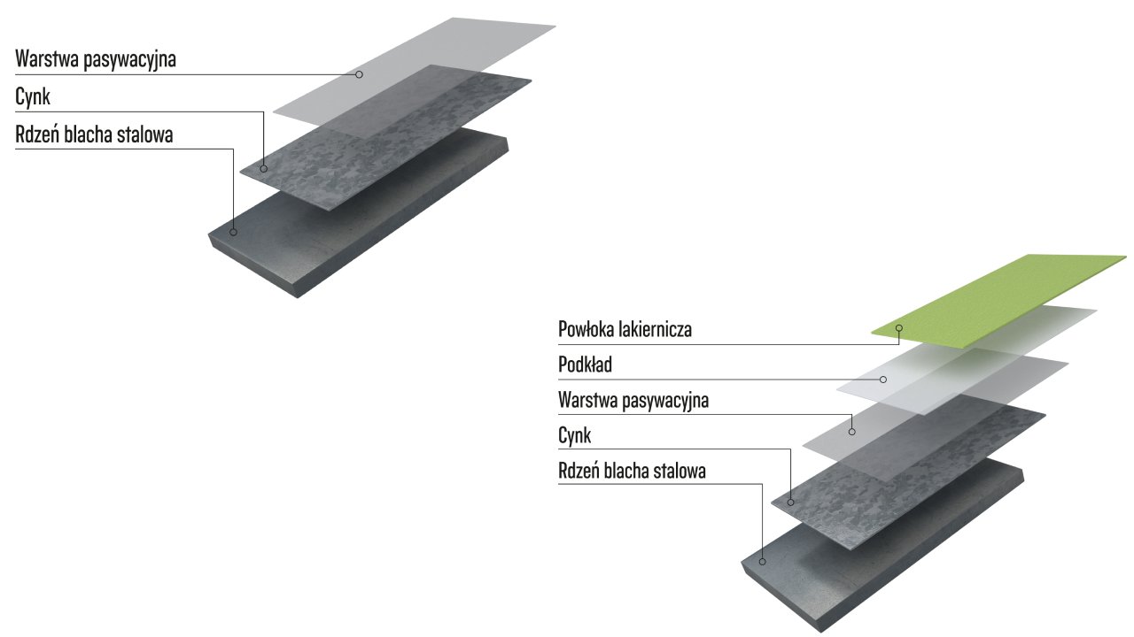 Blacha ocynkowana lub powlekana zbudowana jest ze stalowego rdzenia pokrytego obustronnie powłoką cynku. Na powierzchni cynku znajduje się patyna (zasadowy węglanu cynku) uzyskiwana w procesie produkcyjnym lub naturalnie w wyniku starzenia oraz reakcji cynku z tlenem, wilgocią i dwutlenkiem węgla zawartymi w powietrzu. Na blasze powlekanej dodatkowo nakładana jest warstwa podkładu oraz powłoka lakiernicza. Na Rys.1 przedstawiono różnice w budowie między blachą ocynkowaną a powlekaną.