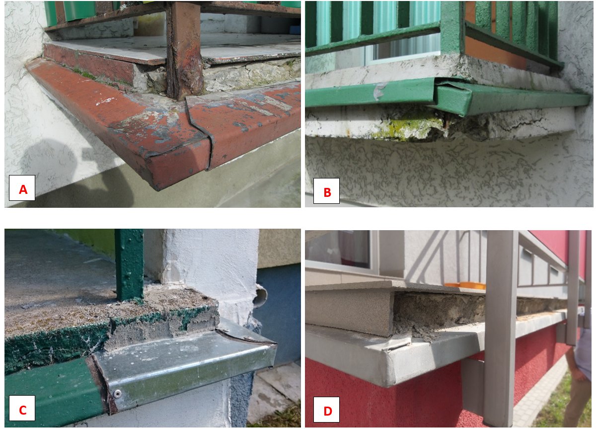 Na typowym balkonie obróbki blacharskie poddawane są oddziaływaniu agresywnego środowiska począwszy od skrajnych temperatur, zmiennego pH w szerokim zakresie, zanieczyszczeń atmosferycznych, skończywszy na obciążeniu wodą opadową oraz wilgocią wysyconą solami mineralnymi (chlorki, węglany, siarczany itd.). Od wielu lat po dzień dzisiejszy opierzenia balkonów wykonywane były najczęściej z blachy ocynkowanej lub tzw. blachy powlekanej. Jednak, niemal w każdym przypadku bardzo szybko ulegają one korozji (Fot. 1). W konsekwencji tego, na podniebieniu balkonowym uwidaczniają się uszkodzenia w postaci: przecieków, wykwitów solnych, łuszczenia się farby lub tynku oraz korozji żelbetu (Fot 2).