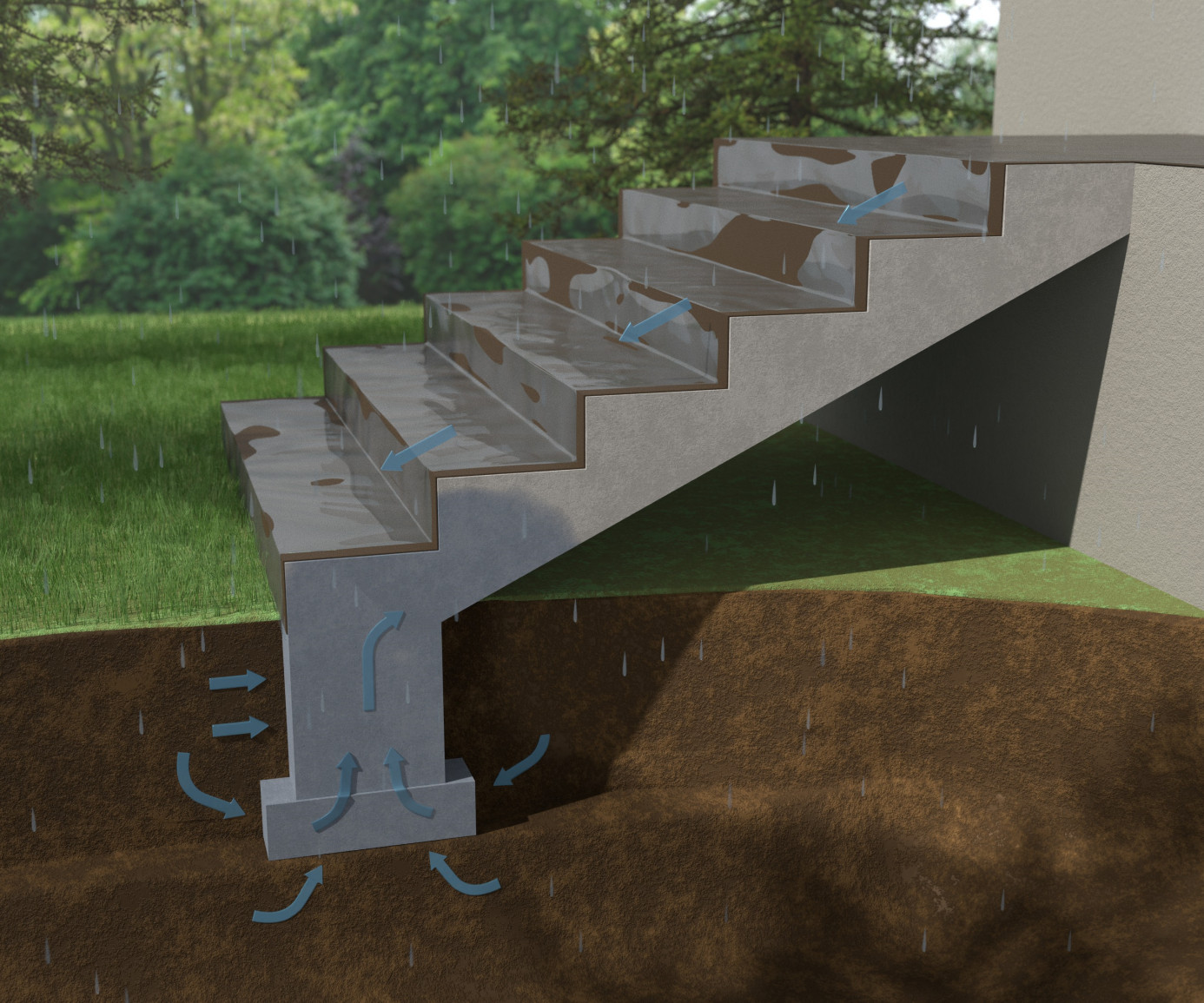 Na schodach podczas opadów deszczu woda spływa po kolejnych stopniach z coraz większą intensywnością, kierując się do najniższego z nich, po czym spływa i wnika do grunt tuż przy krawędzi. Grunt stopniowo nasącza się, podnosząc poziom lustra wody gruntowej, proces ten jest uwypuklony w szczególności na gruntach nieprzepuszczalnych. Wilgotny grunt ma bezpośredni kontakt z elementem konstrukcyjnym tj. fundament oraz ława fundamentowa, a to prowadzi do sytuacji, w której woda przenika do betonowego fundamentu w nim posadowionego, a następnie jest podciągana kapilarnie rys. 2. Brak hydroizolacji zapobiegającej przedostawaniu się wody z gruntu jest często powtarzanym błędem wykonawczym/projektowym i ma znaczące konsekwencje. W takim przypadku nawet poprawnie wykonana hydroizolacja na górnej naziemnej część biegu schodów nie zapobiega odspajaniu się płytek, wykwitom solnym, pękaniu płytek czy wykruszaniu się fug szczególnie na najniższym stopniu schodów.