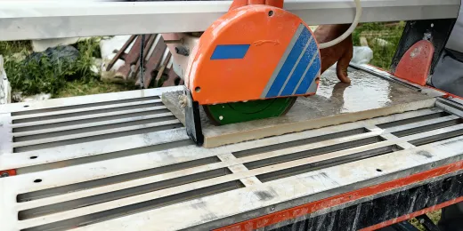 Po zakończeniu montażu listwy wspornika dolnego na podstopnicy oraz policzku schodów fot. 21, pobrano wymiary płyt, po czym przystąpiono do ich cięcia za pomocą piły z tarczą chłodzonej wodą przeznaczonej do cięcia twardej ceramiki fot. 22.