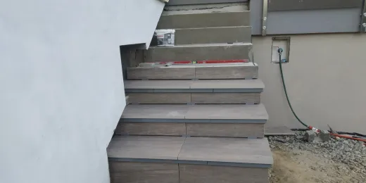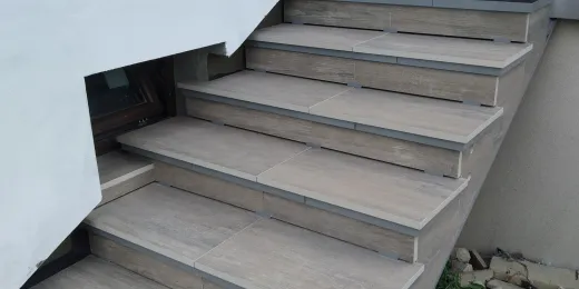 Możliwości wykończenia powierzchni schodów tarasowych jest wiele, jednak by uniknąć przykrych napraw i remontów poniżej opisujemy na przykładzie rzeczywistego przypadku jak wykonać schody wentylowane z płyt gresowych o grubości 20 mm układanych na wspornikach Renoplast SMART z profilami schodowymi Renoplast SW.