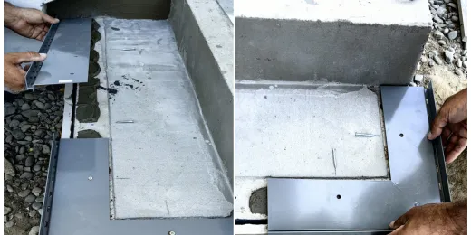 Po zdjęciu profila SW i narożnika NZ SW/90, w uskoku naniesiono cienką warstwę zaprawy uszczelniającej. Docięte płyty ułożono w pozycji pionowej w profilu wspornika dolnego podstopnicy fot. 24. W pierwszej kolejności zamocowano narożnik zewnętrzny NZ SW/90, a potem docięty profil prosty SW fot. 24. Profile SW oraz narożniki nie wymagają łączników, w miejscach połączeń pozostawiamy szczeliny dylatacyjne o szerokości 2 mm i wypełniamy je masą uszczelniającą np. poliuretanową.