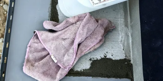 Po odmierzeniu wymiarów pierwszej podstopnicy, docięto pasmo folii EPDM Hertalan EASYCOVER, następnie na podłoże oraz na membranę EPDM naniesiono klej dwustronny Hertalan KS137 i po odczekaniu około 15 minut, membranę przyłożono w docelowym miejscu. Całą powierzchnię dociśnięto rolką silikonową, a krawędzie zamknięto uszczelniaczem Hertalan KS96 fot. 16.