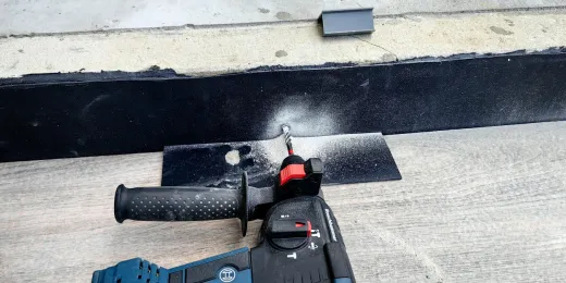 Równolegle przystąpiono do wstępnego przymiaru narożnika zewnętrznego NZ SW/90, na tej podstawie wymierzono długość profila prostego SW. Po jego przycięciu ułożono profil oraz narożniki NZ SW/90 na pierwszej stopnicy, oznaczono miejsca pod montaż kołków, wywiercono otwory, a powierzchnie oczyszczono z urobku fot. 23.