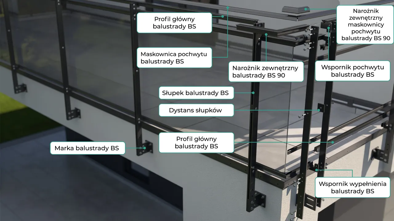 Balustrada składa się z elementów konstrukcyjnych, tj. marki, słupków, śrub łączących oraz pochwytu. Wypełnienie natomiast mocowane jest w profilach aluminiowych z uszczelkami osadzonymi liniowo górą i dołem na całej długości balustrady. Profile zaprojektowano w taki sposób, aby można było zastosować do wypełniania tafle tzw.: szkła bezpiecznego 44.2, czyli  klejonego o grubości 8,76 mm. Alternatywnie do szkła wypełnienie mogą stanowić płyty HPL o grubości 8 mm.