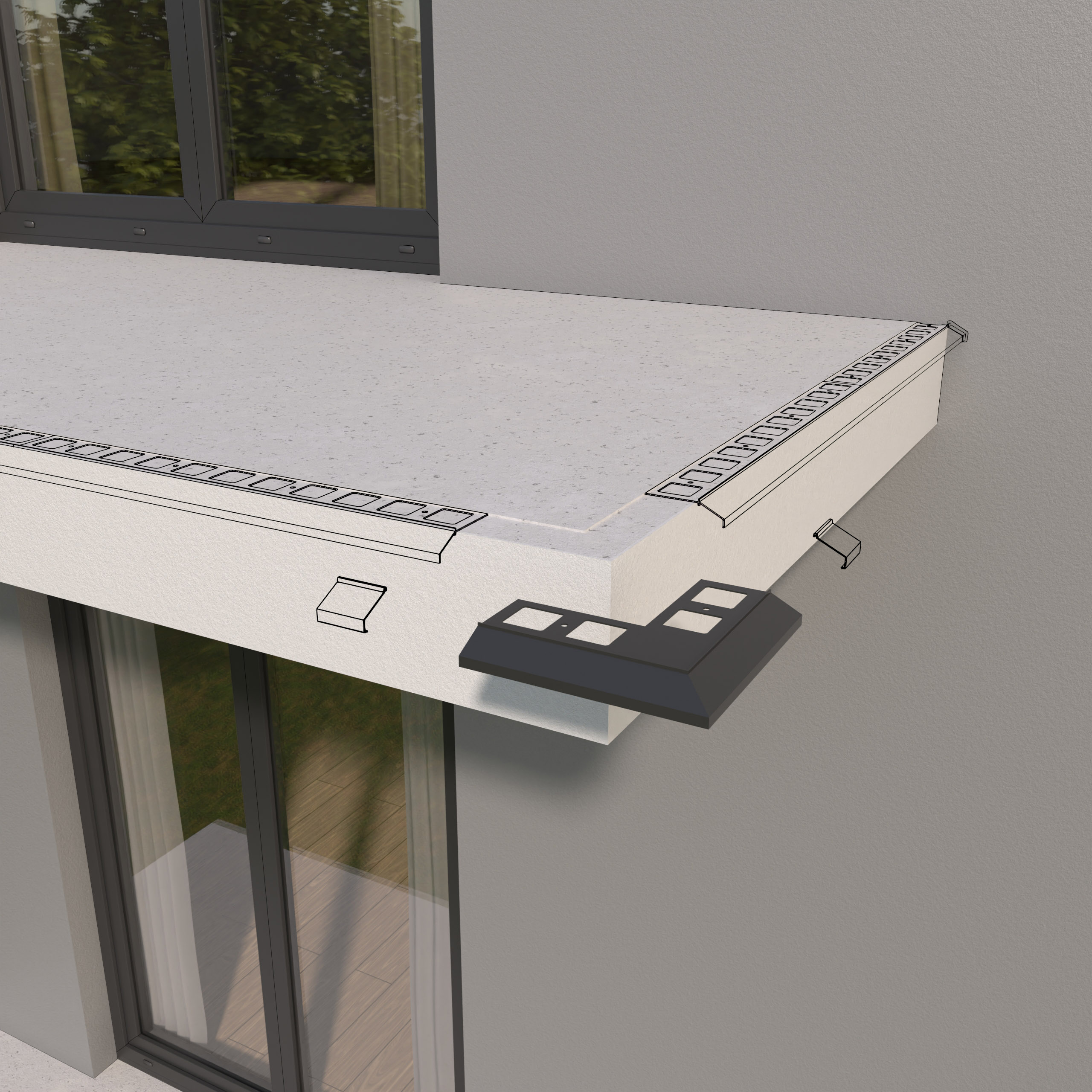 Narożnik zewnętrzny K100 90 jest elementem systemowego wykonania okapu profilami K100, który służy do wykończenia naroży zewnętrznych tarasu i balkonu o kącie 90 stopni.