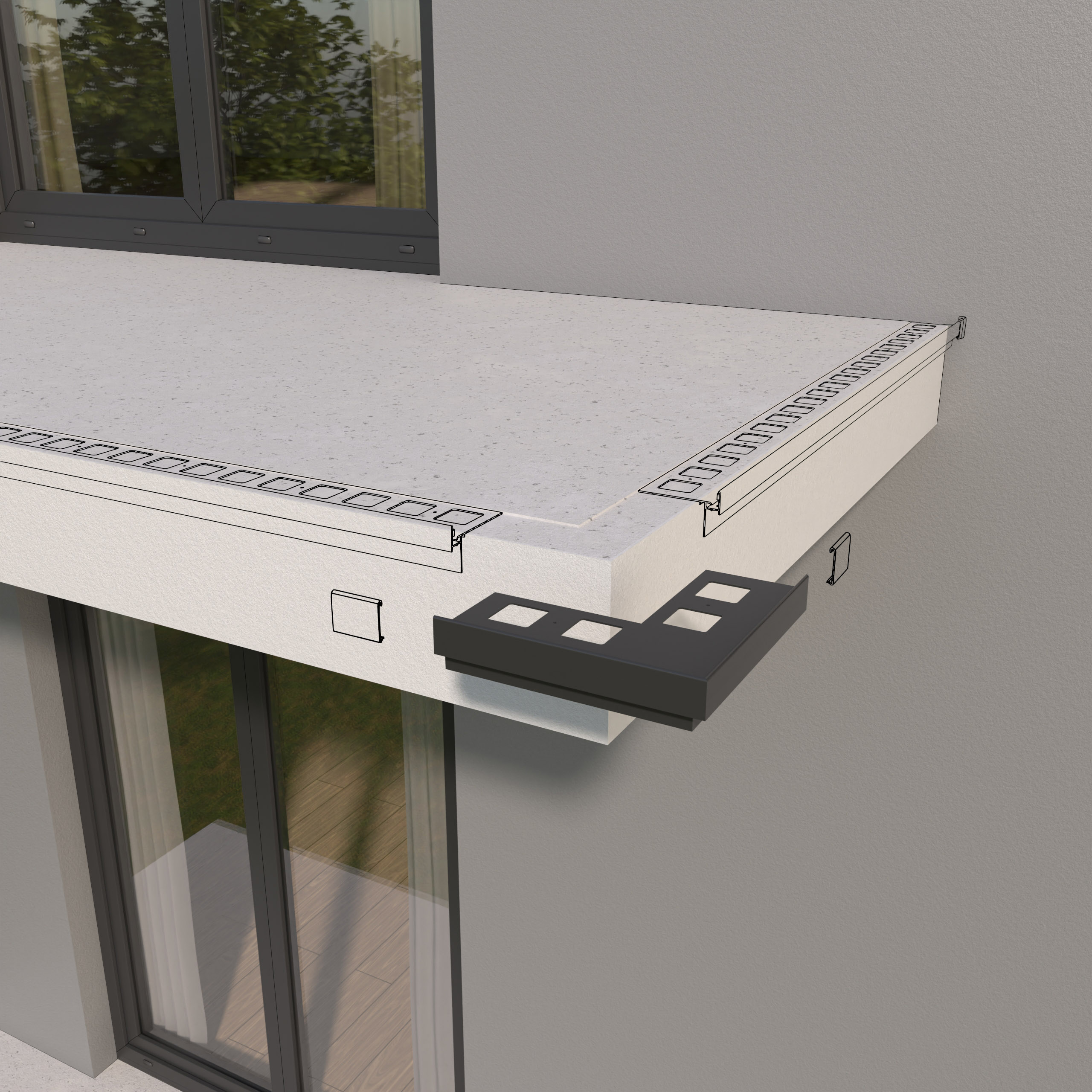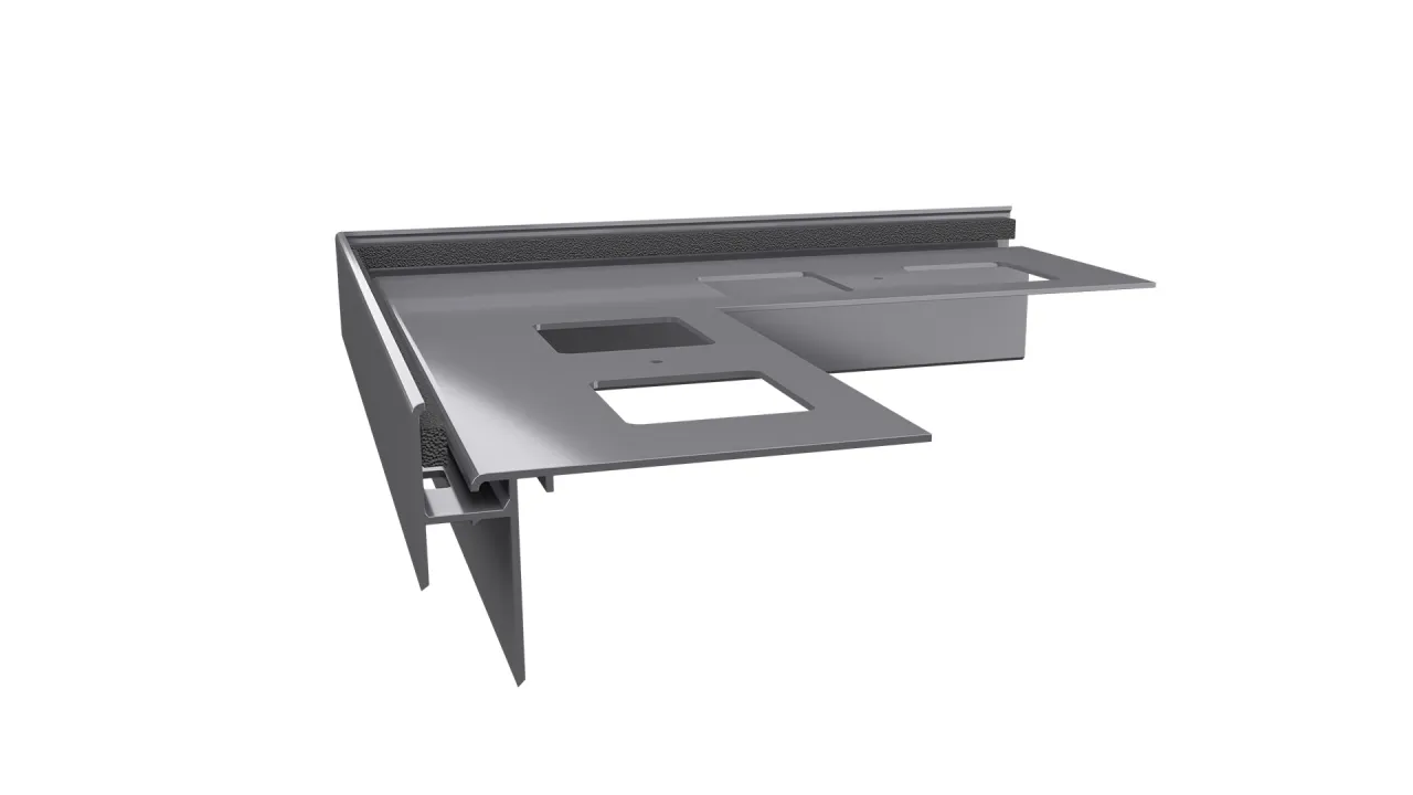 Narożnik zewnętrzny K35 90 jest elementem systemowego wykonania okapu profilami K35, który służy do wykończenia naroży zewnętrznych tarasu i balkonu o kącie 90 stopni.