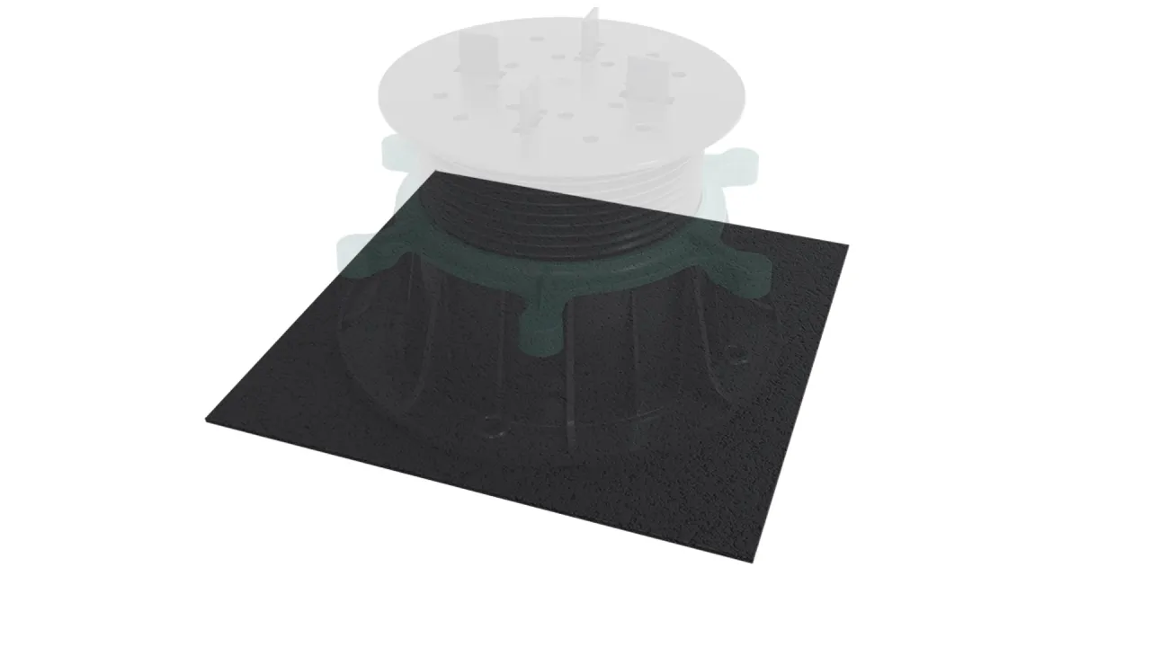 Podkładka wygłuszająca, wykonana z gumy i układana pod wspornikami, redukuje hałas powstający przy użytkowaniu tarasu i balkonu oraz równomiernie rozkłada naprężenia pomiędzy wspornikiem a podłożem.