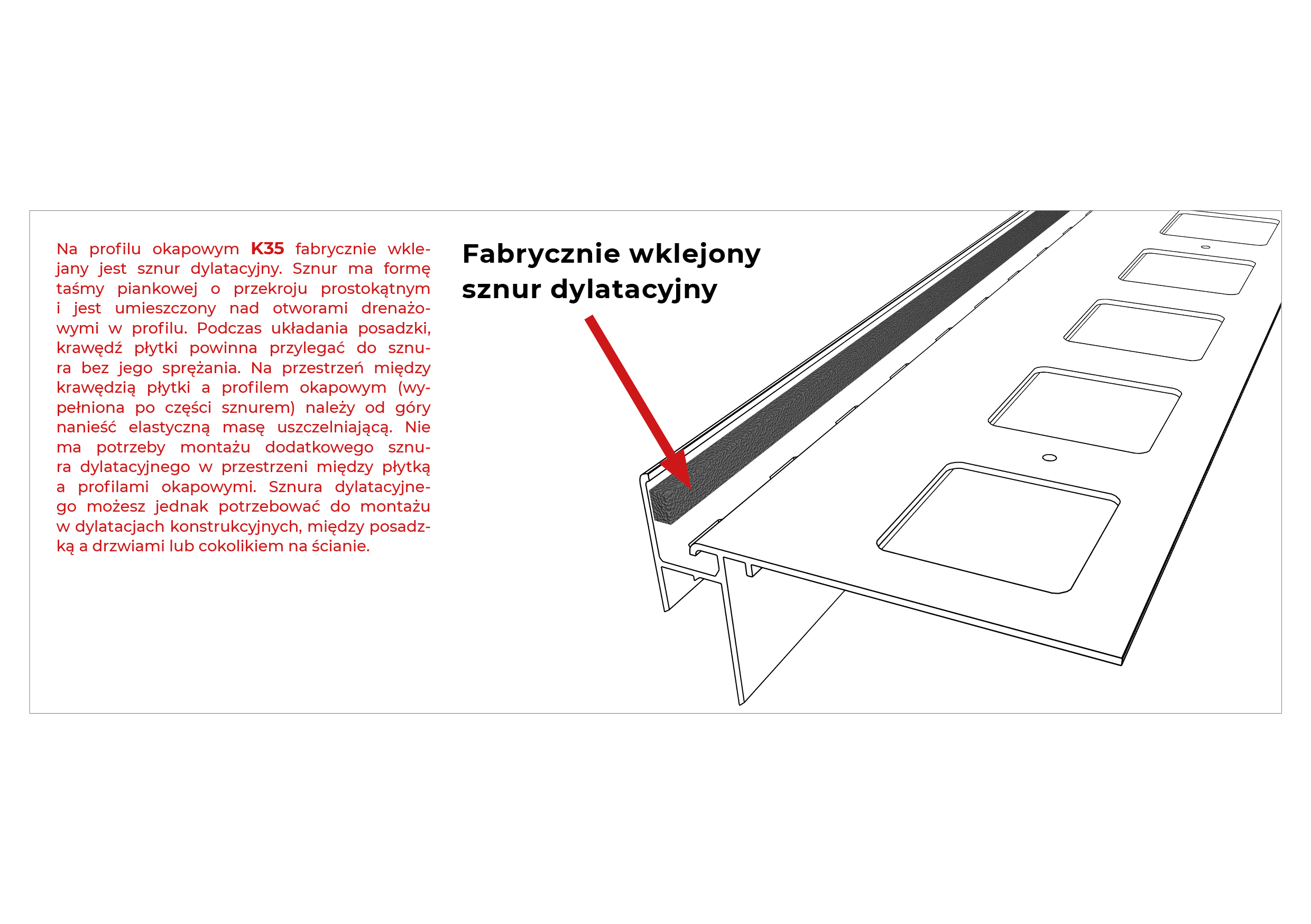 Profil okapowy K35 jest elementem systemu PRO K35 do wykonania tarasów i balkonów z posadzką z płytek ceramicznych układanych na mineralnej zaprawie klejowej, z zastosowaniem hydroizolacji podpłytkowej z zaprawy uszczelniającej.
