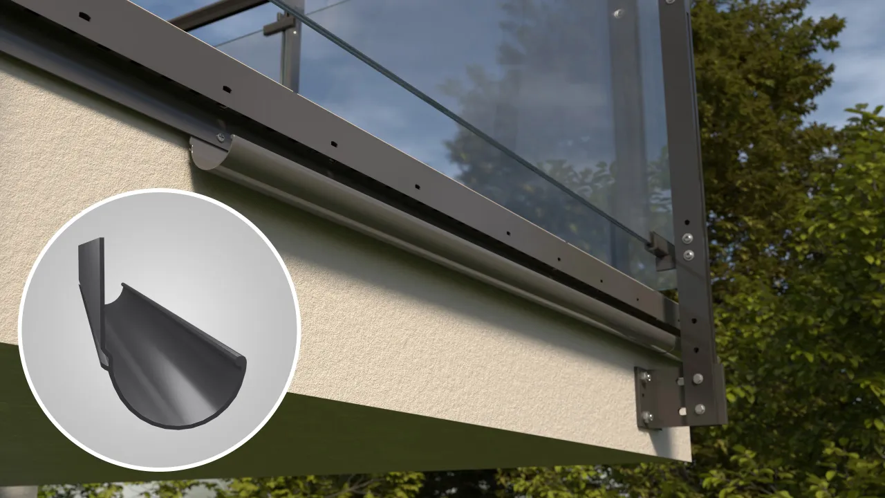 aluminiowa rynna o średnicy 50 mm, mocowana do profilu za pośrednictwem wkrętów ze stali nierdzewnej. Elementami uzupełniającymi są kolanka i rury spustowe o długości 50, 100 lub 200 cm.