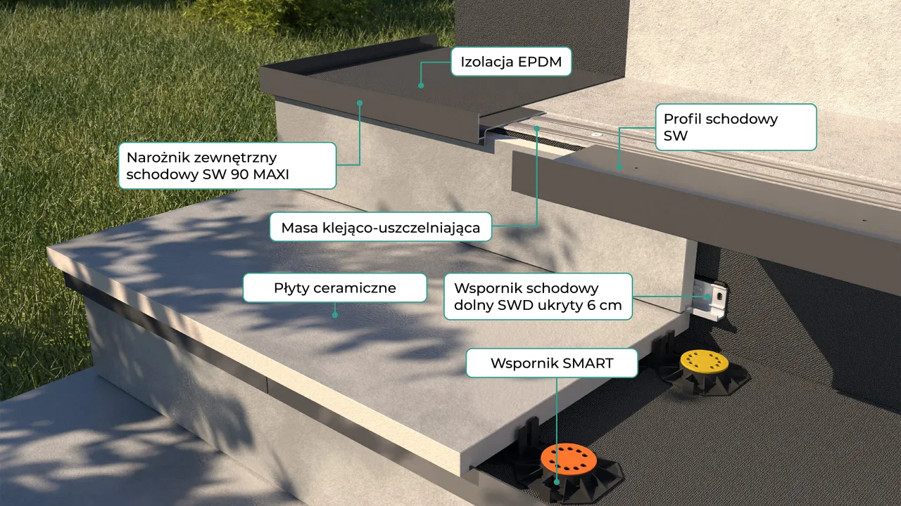 System do wykonania okładziny schodów zewnętrznych w technologii wentylowanej. W skład systemu schodowego SW wchodzą profile SW z elementami uzupełniającymi jak narożniki zewnętrzny schodowy SW90 MAXI, wsporniki schodowe dolne SWD lub wsporniki schodowe dolne SWD ukryte, wsporniki schodowe górne SWG, wsporniki tarasowe SMART, membrana EPDM z narożnikami wewnętrznymi i zewnętrznymi, klejem i uszczelniaczem oraz taśmą samoprzylepną. Istotną cechą systemu jest możliwość wykonania schodów zewnętrznych o dowolnej bryle konstrukcji w oparciu o okładzinę z płyt ceramicznych o grubości 2 cm. System schodowy SW to jedyne kompletne rozwiązanie wykonania schodów z okładziną wentylowaną.