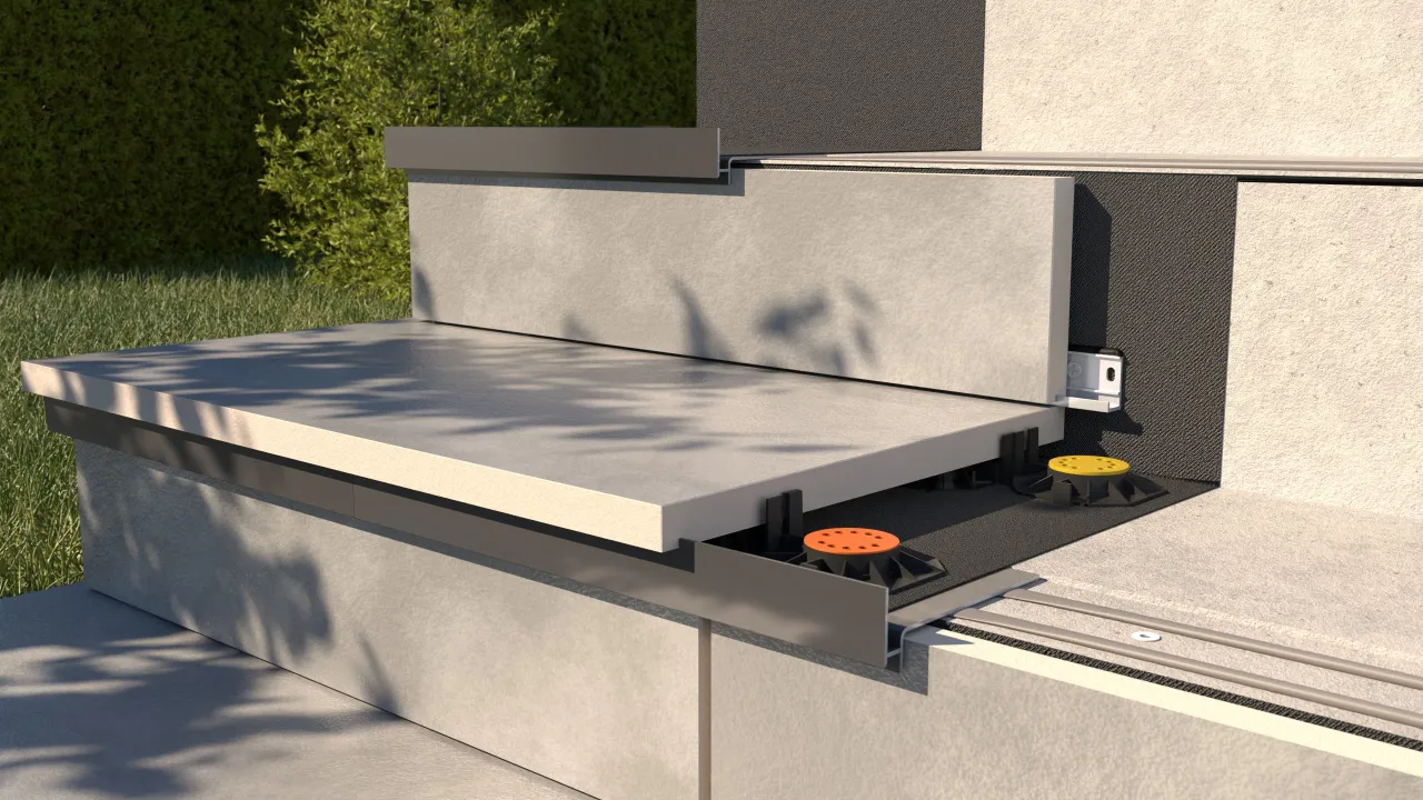 Jedyny na rynku system umożliwiający wykonanie schodów zewnętrznych w technologii wentylowanej, z wykorzystaniem grubowarstwowych płyt ceramicznych (2 cm).
