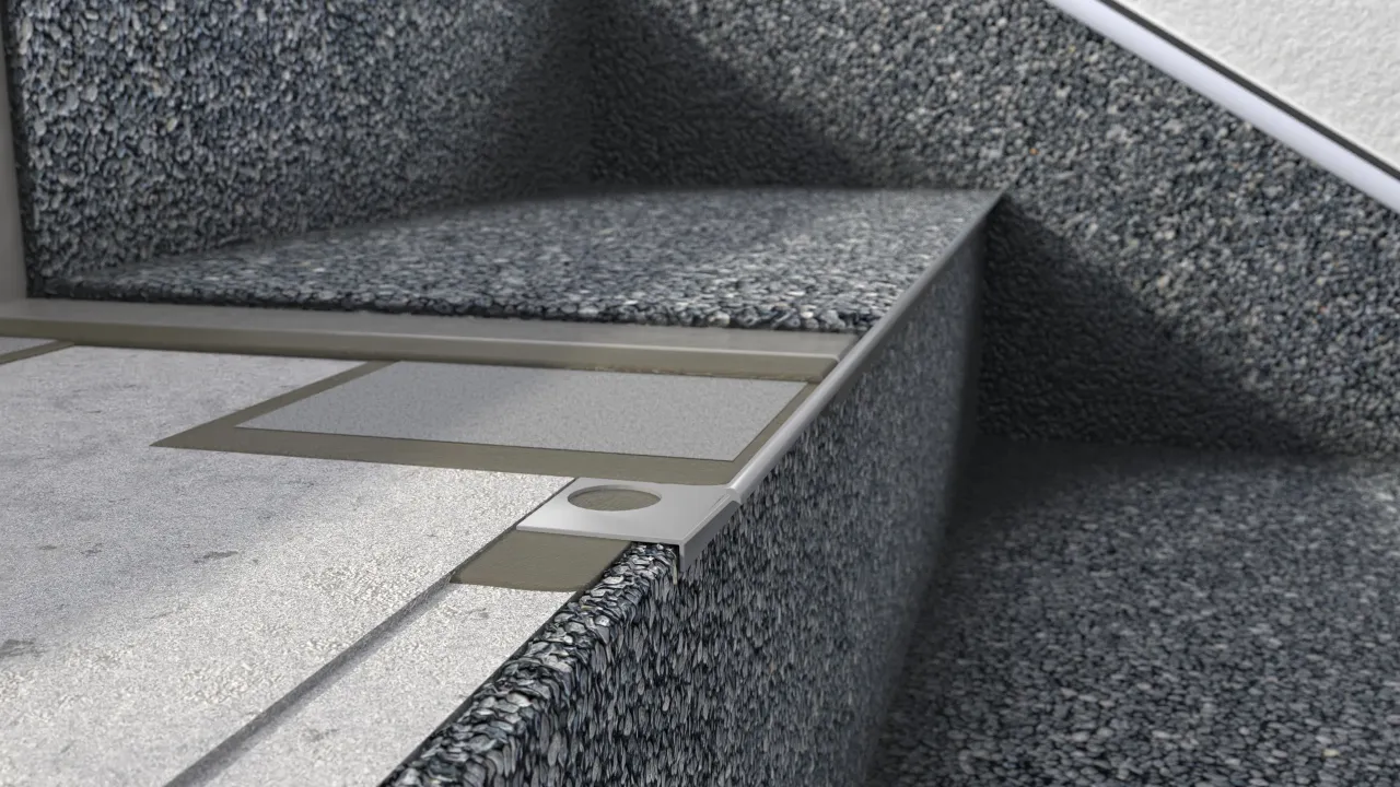 Systemowe wykończenie i wzmocnienie krawędzi schodów z okładziną wykonaną w technologii kamiennego dywanu na krawędzi stopnia schodowego.