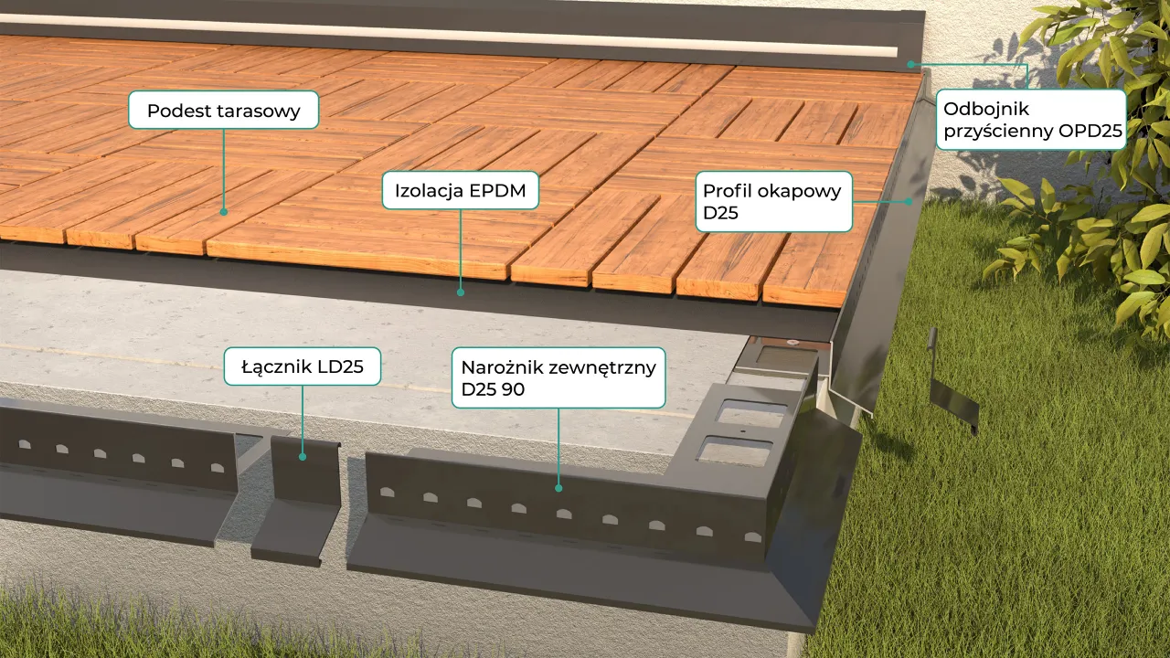 System do wykonywania tarasów i balkonów z posadzką z podestów tarasowych. W skład systemu MULTI D25 wchodzą profile okapowe D25 z elementami uzupełniającymi jak narożniki zewnętrzne i wewnętrzne D25 90 i D25 135 o kątach 90º i 135º, łączniki LWD25 i odbojniki przyścienne OPD25, membrana EPDM z narożnikam RENOCORNER, klejem RENOSTICK RS10, uszczelniaczem RENOSEALANT RS09 oraz taśmą samoprzylepną RENOBAND BT. Istotne cechy systemu to kompletność umożliwiająca wykonanie posadzki tarasu i balkonu bez konieczności dorabiania dodatkowych elementów, ogromną prostota rozwiązania za bardzo przystępną ceną.