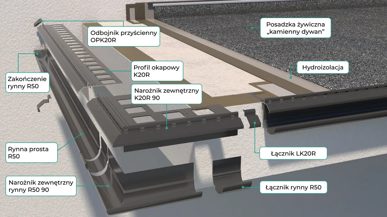 System do wykonania tarasów i balkonów z posadzką z żywic w technologii kamiennego dywanu charakteryzujący się zastosowaniem profili okapowych K20R. W skład systemu wchodzą profile okapowe K20R z elementami uzupełniającymi jak narożniki zewnętrzne i wewnętrzne K20R 90 i K20R 135 o kątach 90º i 135º, łączniki LK20R i odbojniki przyścienne OPK20R. Wykonanie tarasu lub balkonu w technologii kamienny dywan z wykończeniem strefy okapowej profilem K20R zapewnia skuteczne odprowadzenie wody opadowej z powierzchni posadzki balkonu za pośrednictwem systemowej rynny R50 z kolankami i rurą spustową, trwałość i odporność antykorozyjną profili, kompletność systemowego rozwiązania oraz estetyczny wygląd.